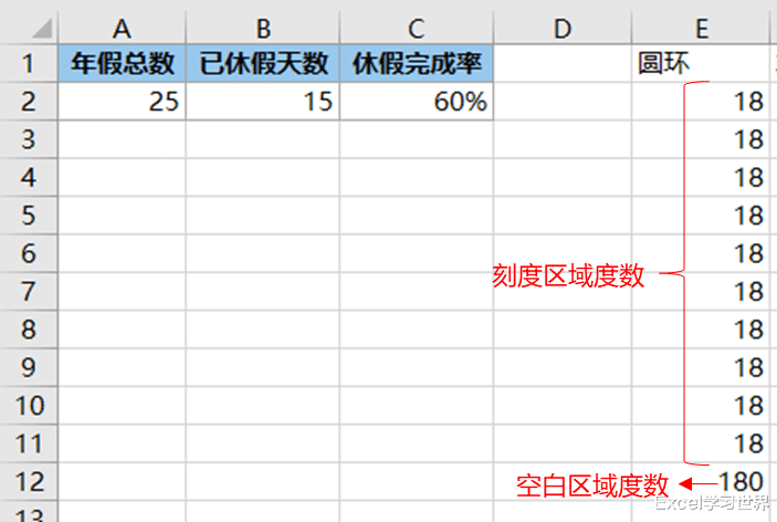 刻度区域的每单元格的值为刻度区域总度数除以分区数;