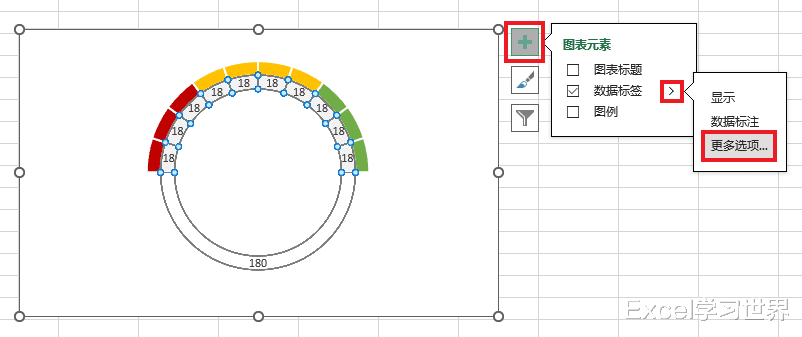 10. 选中内圈的圆环 --> 点击图表右上角的“+”号 --> 选择“数据标签”-->“更多选项”