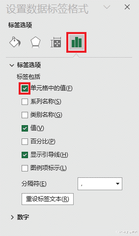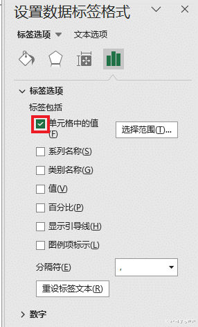 13. 在“数据标签”设置区域仅勾选“单元格中的值”,取消勾选其他所有标签。