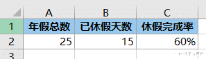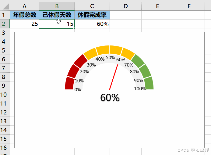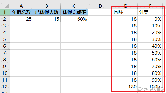 案例:根据下图 1 中的休假完成率设置出仪表盘图表,效果如下图 2 所示。