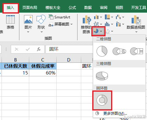 2. 选中 E 列的数据 --> 选择任务栏的“插入”-->“饼图”-->“圆环图”