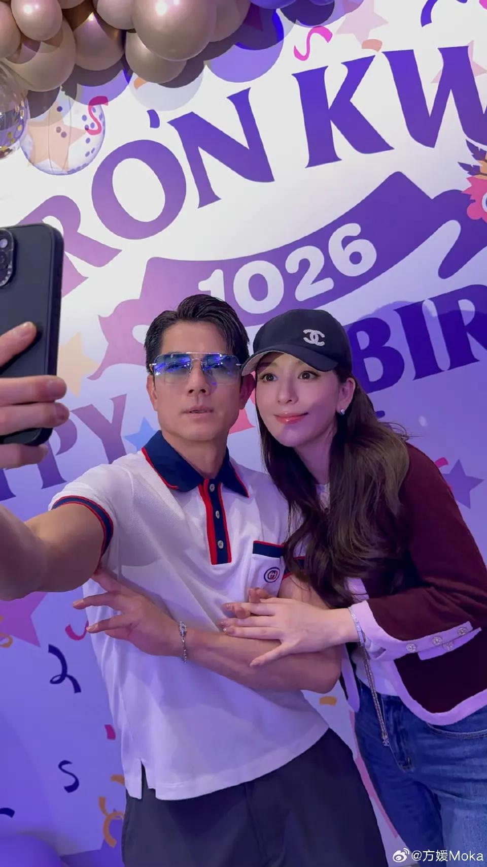 郭富城和方媛还一起拍了合影,方媛挽着老公手,郭富城负责拿手机自拍,两人看起来好甜蜜,男帅女美,尽显恩爱。