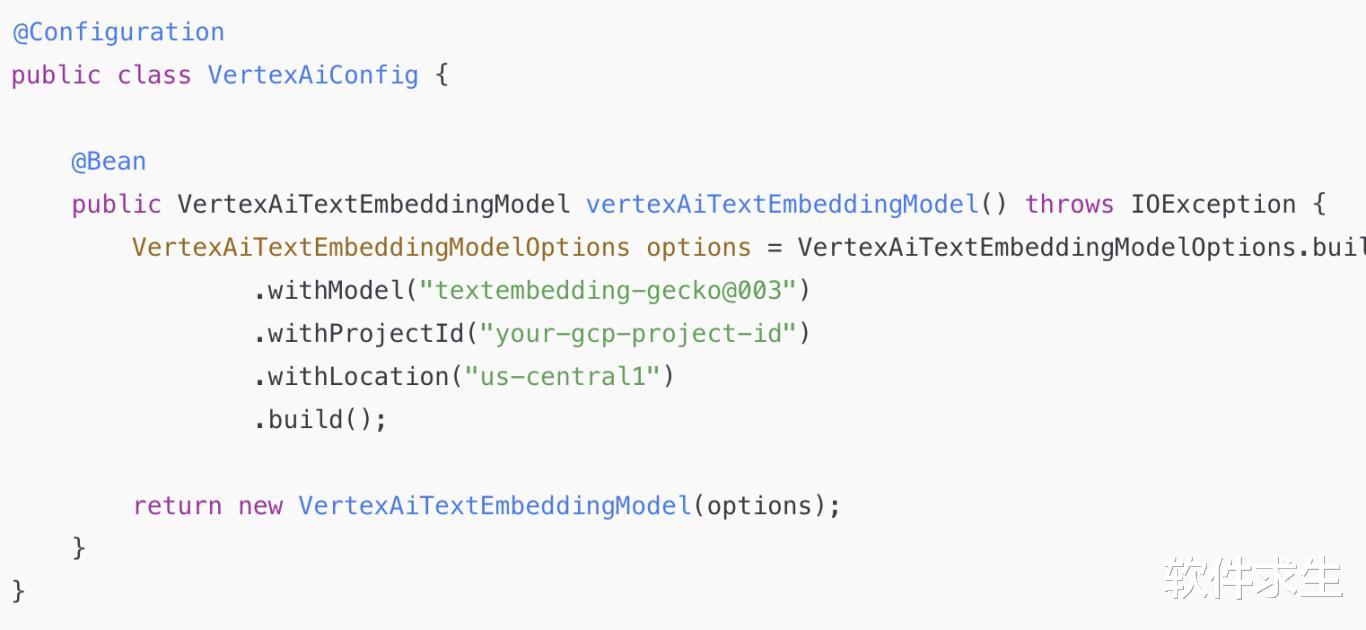 手动配置 VertexAiTextEmbeddingModel当然,有时候我们需要更灵活的控制,想自己手动创建模型。