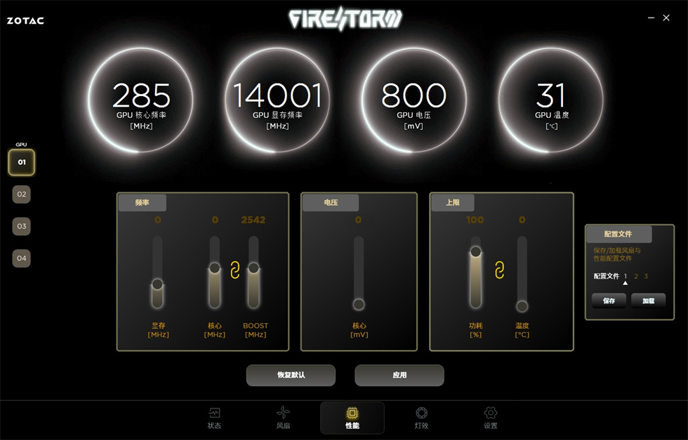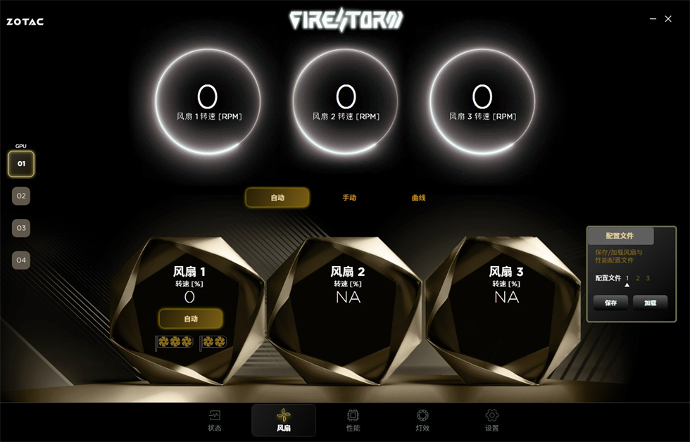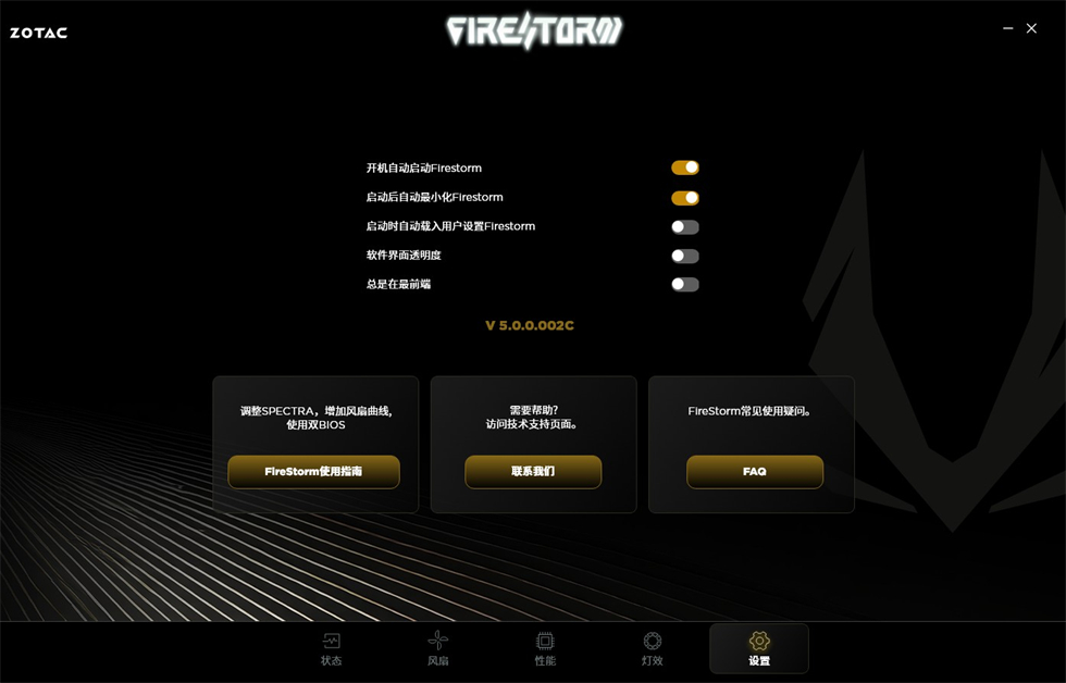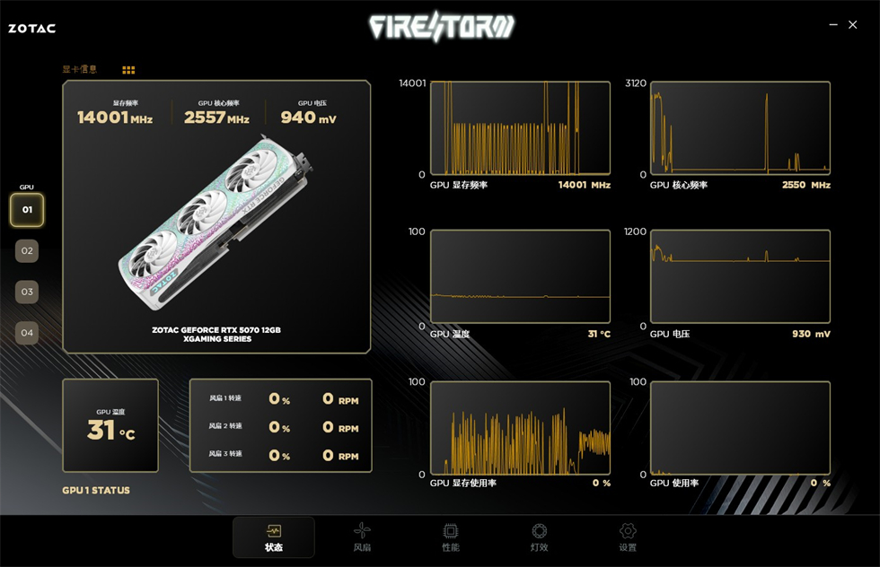 驱动FireStorm可以查看索泰显卡状态、风扇、性能、灯效和设置。