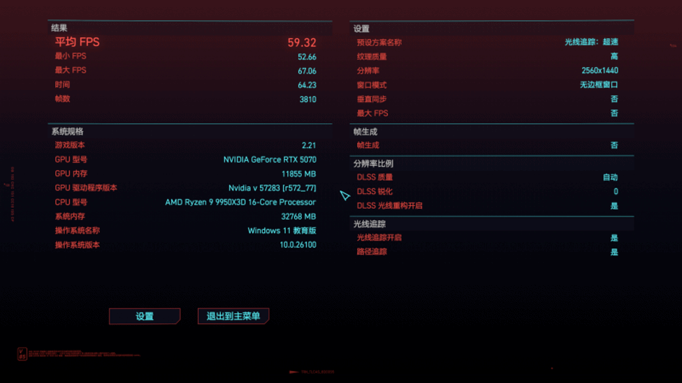 赛博朋克2077,2K分辨率,选择快速预设方案光线追踪:超速,未开启帧生成,平均帧数59.32;开启帧生成2X,平均帧数100.42。