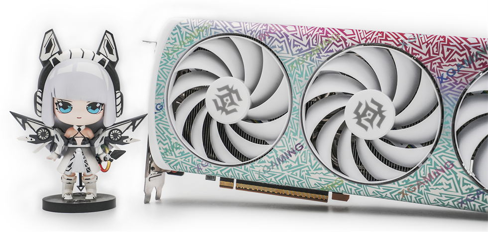 显卡背面覆盖合金背板已经是传统艺能了,背板底漆为白色,搭配有青色和紫色的图案设计,辅以“XGAMING”的标志,颇为突出,右侧的大面积开孔构成了贯穿式风道,有利于空气穿透散热,进一步提升散热效能。