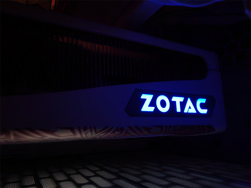 显卡散热罩线条相对柔美,这个角度能看到密集阵列散热鳍片,还能够看到冰脉3.0复合热管,电源接口已经是采用ATX 3.1规范的12V-2×6了,右侧的“ZOTAC”采用了ARGB设计,支持1600万色和多种灯效模式调节。