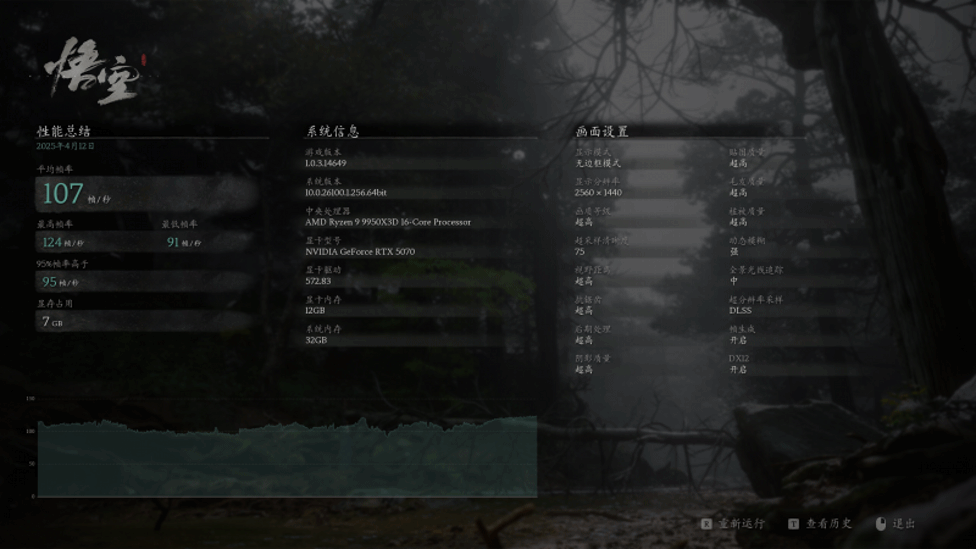 《黑神话:悟空》,2K分辨率,选择超高效果,开启DLSS,开启全景光线追踪:中,平均帧率107;开启全景光线追踪:超高,平均帧率85,均很流畅。