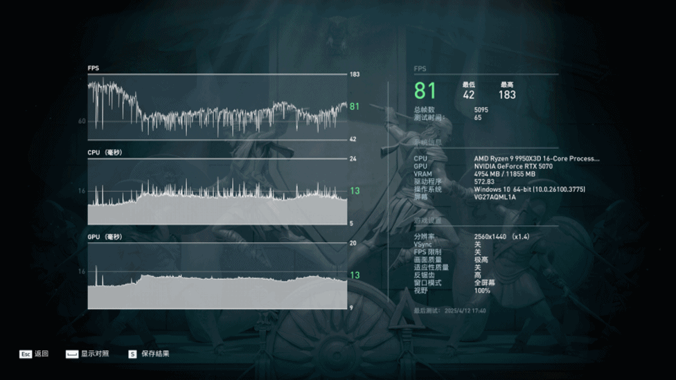 众生平等奥德赛,2K分辨率,画质极高,平均帧率81。英灵殿,2K分辨率,画质极高,平均帧率131。孤岛惊魂5,2K分辨率,画质极高,平均帧率115。孤岛惊魂6,2K分辨率,画质极高,平均帧率151。