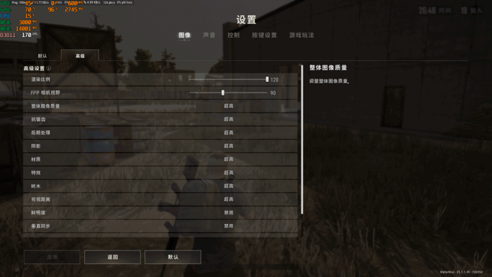 吃鸡设置如上图,渲染比例开到120,效果最高,2K分辨率,帧数在160-185浮动。