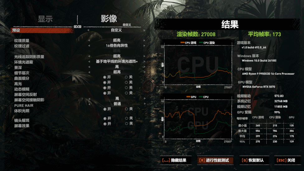 古墓丽影:暗影,2K分辨率,设置如上,平均帧率173。荒野大镖客2,设置如上,2K分辨率,预设居中,平均帧数114.496;预设拉到头,平均帧数114.64。