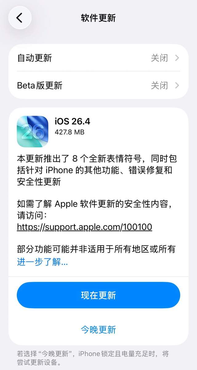 北京时间3月25日,苹果面向全球iPhone、iPad用户推送iOS/iPadOS 26.4正式版,版本号23E246,距离上一次系统更新仅间隔20天,属于典型的高频迭代优化更新。此次升级聚焦功能新增、体验修复、生态开放三大维度,既有离线识曲、AI歌单等实用黑科技,也有CarPlay开放第三方AI、失窃保护强化等重磅改动,同时国行版Apple Intelligence持续缺位、软硬件强制捆绑等争议也随之发酵,成为果粉圈热议的焦点。