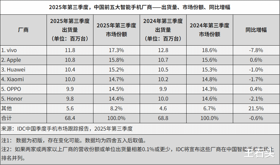 IDC数据显示,2025年第三季度中国智能手机出货量约6840万台,同比下降0.6%,市场整体增长乏力。