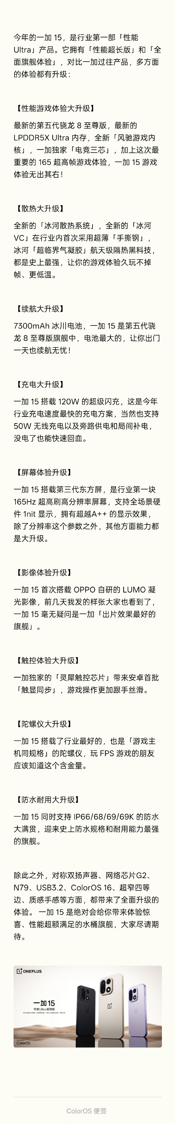 此外,近日 @李杰Louis 也发长文介绍了一加15相比前代产品的亮点。据其称,“今年的#一加15#,是行业第一部「性能Ultra」产品。它拥有「性能超长版」和「全面旗舰体验」,对比一加过往产品,多方面的体验都有升级”。而从目前已经预热的信息来看,一加15将成为一加有史以来配置最强的旗舰产品已经是可以确定的了。