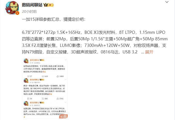 数码博主“数码闲聊站”继近日曝出了一加Ace6的详细配置参数之后,日前,再次曝出了一加15的详细参数,据其称,“一加15详细参数汇总,猜猜定价吧:6.78"2772*1272p 1.5K+165Hz,BOE X3发光材料,8T LTPO,1.15mm LIPO四等边直屏;前置32Mp,后置50Mp 1/1.56"主摄+50Mp超广角+50Mp 85mm 3.5X F2.8潜望长焦,LUMO影像;7300mAh+120W+50W,对称双扬声器,支持N79频段,自定义按键,3D超声波指纹,0816马达,USB 3.2 Gen1,最轻薄版本8.18mm/211g”。