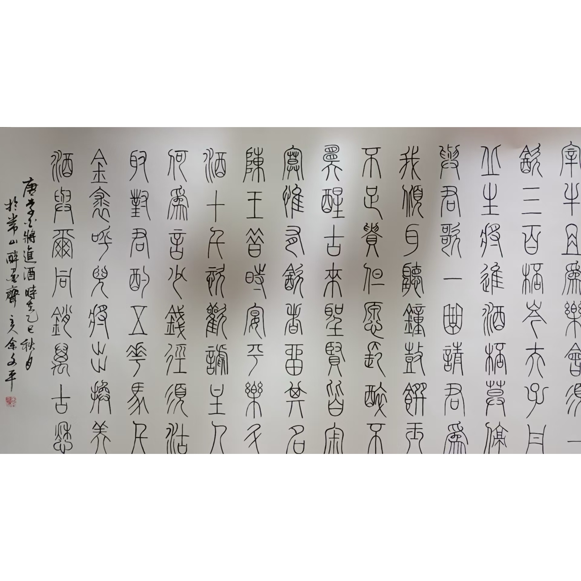 在近现代书法收藏的价值坐标系中,余文平的铁线篆《将进酒》是一座 “多维价值金字塔”。这幅长 2.55 米、宽 70 厘米的超大尺幅作品,以 “技艺的极致性”“文本的超级 IP 属性”“作者的行业话语权”“市场的稀缺供给” 四大支柱,构建起无可替代的收藏价值壁垒。它不仅是铁线篆技艺当代传承的巅峰之作,更是文化资产配置中 “抗风险、高增值” 的核心标的,其价值深度与广度,远超普通书法藏品。