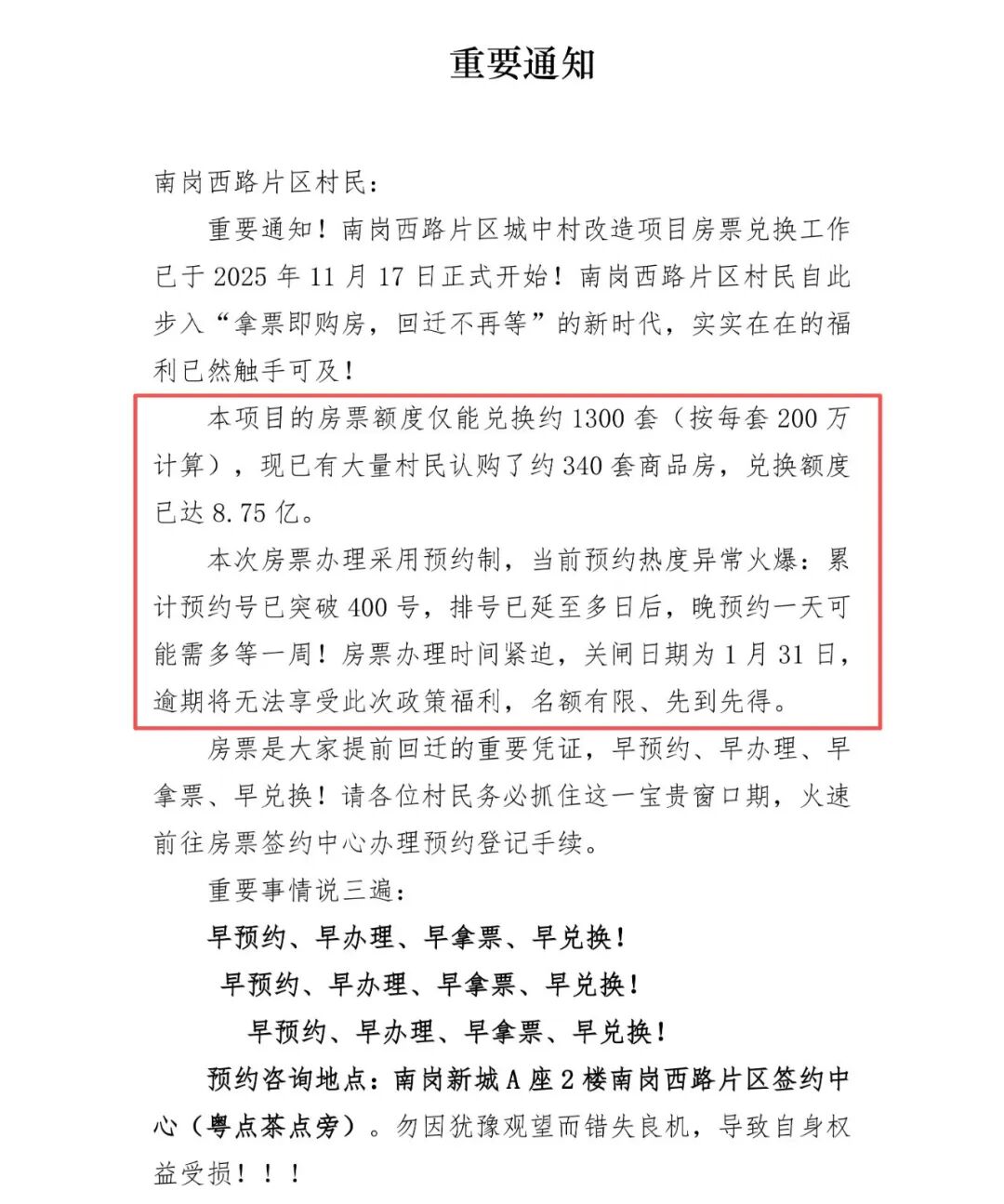 南岗西路片区传出村民用房票认购340套商品房、兑换额度达8.75亿元的捷报。