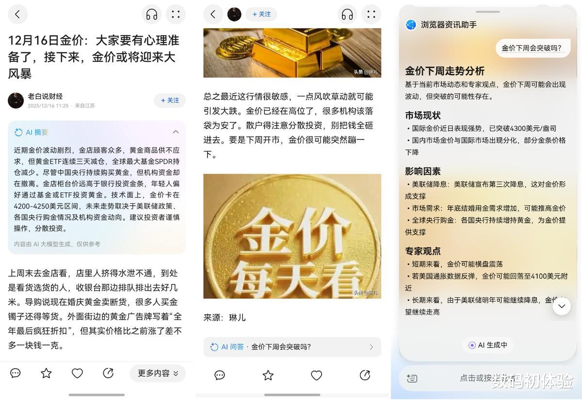 最近想要了解下股市行情,就在华为浏览器刷一刷财经新闻。看到一篇当前对金价的分析文章,在“AI问答”的帮助下继续了解了“金价下周是否会突破”等讯息,进一步为我这样的“门外汉”科普了,观点明确,来源清晰。这种“即看即问”的体验,就像身边坐了个懂行的朋友,阅读的连贯性没被破坏,沉浸感拉满。