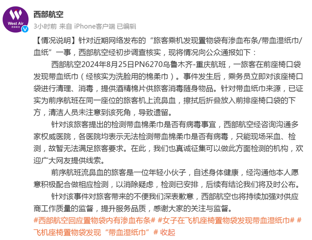 针对近期网络发布的“旅客乘机发现置物袋有渗血布条/带血湿纸巾/血纸”一事,西部航空经初步调查核实,现将情况向公众通报如下: