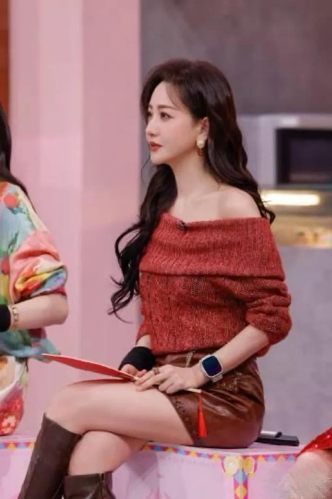 杨蓉的中年穿搭真时髦!一字肩针织衫+棕色皮裙,洋气又高级!