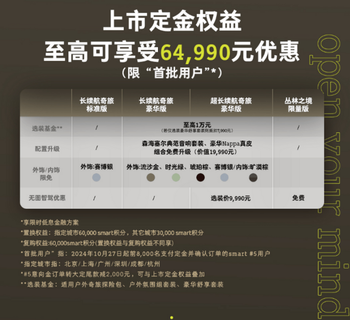 为回馈广大密友厚爱,“首批用户”下定全新smart精灵5号,可至高享受64,990元的七重惊喜BUFF。下定长续航奇旅豪华版、超长续航奇旅豪华版的“首批用户”,可获至高10,000元选装基金,还可免费升级价值19,990元森海塞尔音响套装+豪华Nappa真皮组合,更可免费获得限免车色。此外,下定全新smart精灵5号还可享低息金融方案、至高可享60,000 smart积分的置换权益或复购权益等。