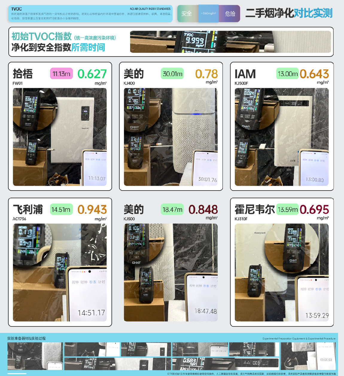 二手烟中含有尼古丁和多种有害颗粒物,扩散速度快病且附着力比较强,对除二手烟空气净化器的过滤和分解能力是很大的考验。本次测试通过密闭空间点燃烟饼制造高浓度烟雾,记录各除二手烟空气净化器在运行后降低TVOC浓度所需的时间与最终数值,综合评估二手烟净化效果。