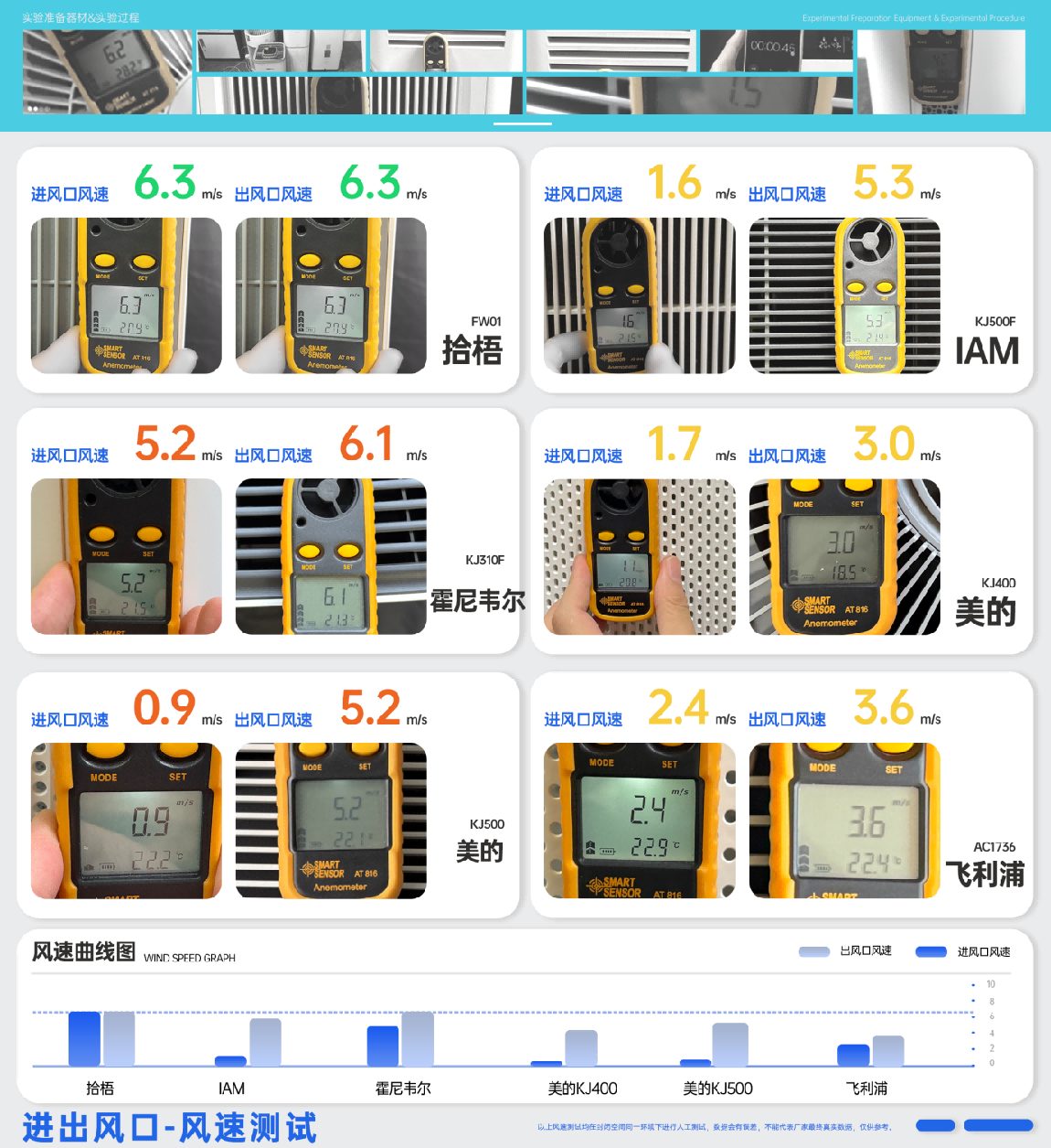 这几款除二手烟空气净化器的进风口和出风口风速整体偏低,部分机型进风不足1m/s,整体循环效率受限。虽然部分出风口数据相对尚可,但在快速覆盖和高效净化方面仍与拾梧存在差距。
