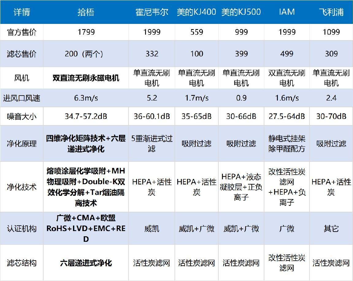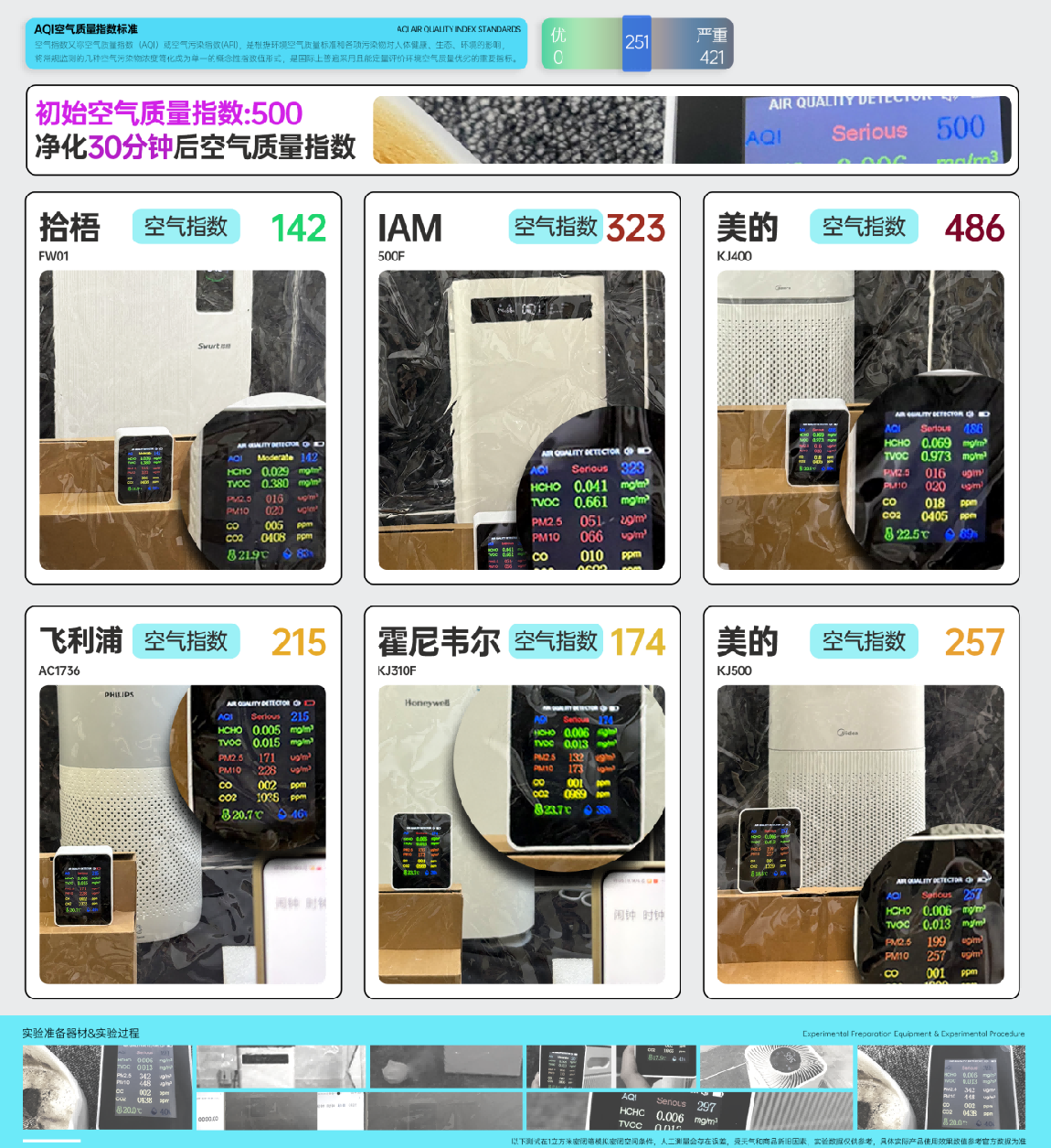 测试结论:拾梧FW01>霍尼韦尔KJ310F=美的KJ500=飞利浦AC1736>美的KJ400=IAM