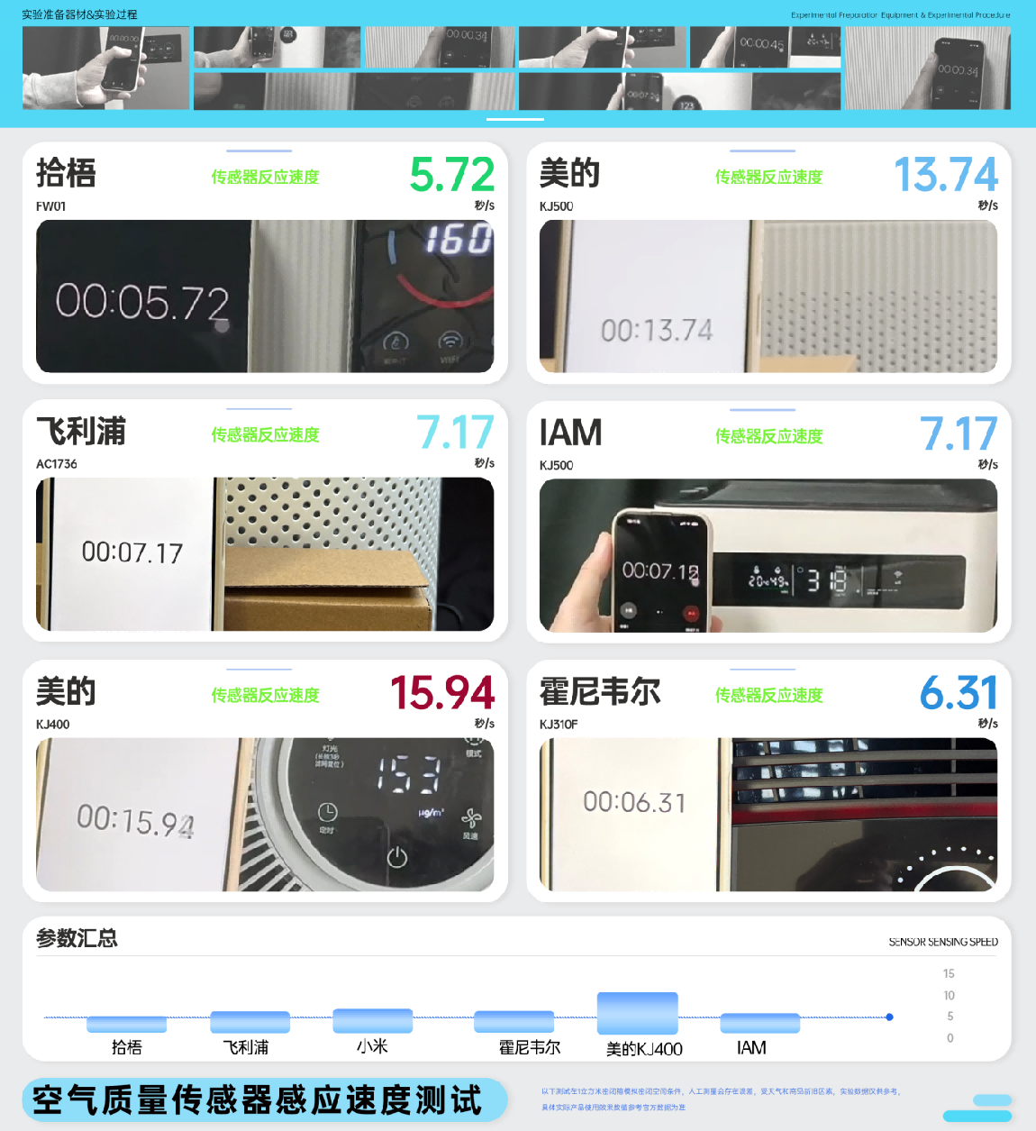 空气净化器的传感器灵敏度决定了能否在第一时间捕捉到污染物的出现。在统一实验环境中制造污染源,同时开启计时,记录各机型空气质量传感器从检测到污染物到数值变化所需的时间。