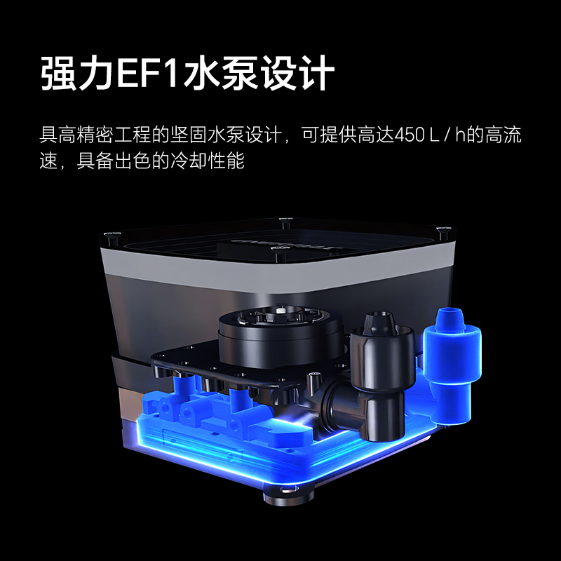 在水冷头其他硬件配置上,安耐美LIQTECH XTR幻彩锐龙360一体式水冷采用EF1水泵,可以提供高达450L/h的超高流速,搭配“SCT分流设计”,从而实现强大的降温能力。