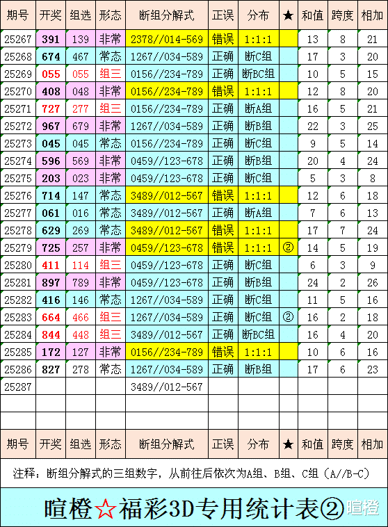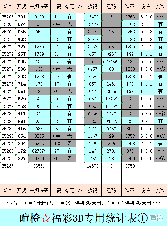 25287期:暄橙福彩3D综合条件(本期将在10月28日21:15开)一、上期回顾 ☆1、上期开奖号:8 2 7。2、和值= 17,跨度= 6。3、常态组六,122路组合。4、热度分布(热:温:冷)1:2:0。5、上期胆码错,断B组。二、本期条件 ☆1、三期缺码:03569。2、热:14678,温:2,冷:0359。3、断组分解式:3489//012-567。4、四胆:④⑤⑦⑨;三胆:④⑤⑦。5、近期适当关注热度(热:温:冷)1:1:1。①假定“热度(热:温:冷)1:1:1”成立,得出20注组选:012,024,026,027,028,123,125,129,234,236,237,238,245,249,256,257,258,269,279,289。②继续假定“三胆出码”,得出11注组选:024,027,125,234,237,245,249,256,257,258,279。三、术语解释 ☆1、三期缺码:0至9这十个自然数当中,未在近三期开奖号出现的数字。2、热度(热温冷):自然数0至9,在近七期开奖号中,出现3次及3次以上的数字,称为热码;出现2次的数字,称为温码;出现1次和未出现的数字,称为冷码。某个数字在开奖号中出现几个,就按几次计算。3、断组分解式:将0至9这十个自然数,分成三组数字,从前往后依次为A组(4码)、B组(3码)、C组(3码),一般情况下,有一组数字不出码,偶尔会有两组数字不出码。A组不出码的情况相对较少。断组为主,分解为辅。4、常态组六号码:同时包含大数、小数、奇数、偶数、质数、合数的组六号码,共有72注。统计表中,简称“常态”。5、非常态组六号码:全大数、全小数、全奇数、全偶数、全质数、全合数等六种形态的组六号码,共有48注。统计表中,简称“非常”。★提醒:彩市有风险,参与须谨慎!理性购彩,量力而行!多看少买,不要痴迷!任何条件都有出错的时候!水平有限,仅供参考!友好互动,好运相伴!