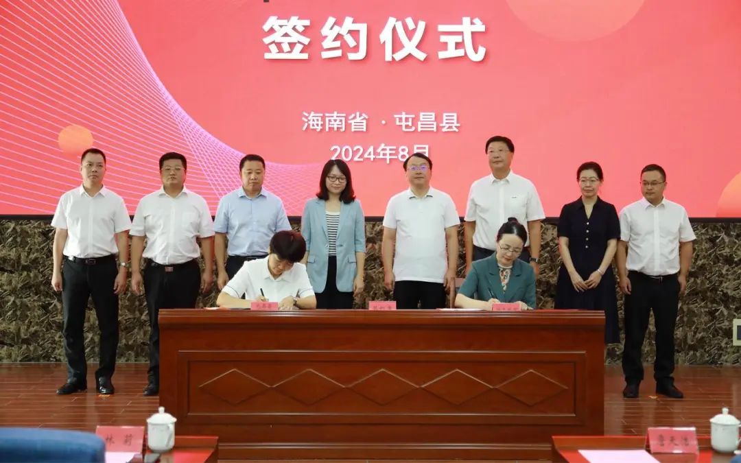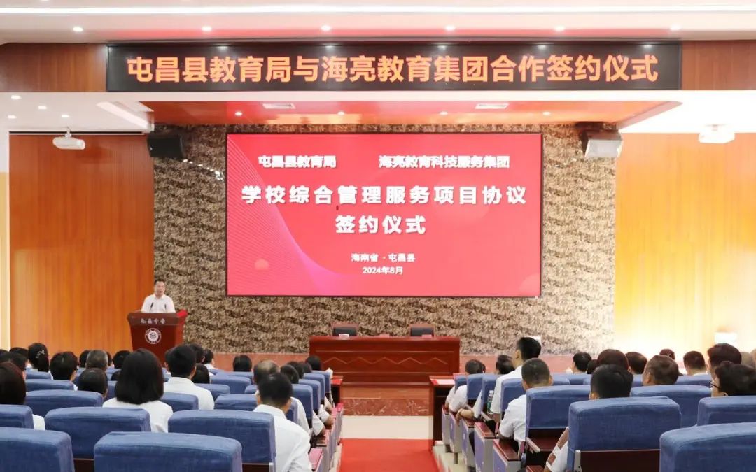 8月27日,海南省屯昌县教育局与海亮教育科技服务集团举行屯昌中学综合管理服务签约仪式。屯昌县委书记林莉,屯昌县委副书记、县长赵英杰,县委副书记吴攀龙,县委常委、副县长何发亮,海亮集团副总裁、明康汇生态农业集团董事长詹天浩,海亮教育科技服务集团高级顾问辛颖,副总裁彭蕾,人资首席专家兼海亮优才教师研修院副院长戴金波等出席。