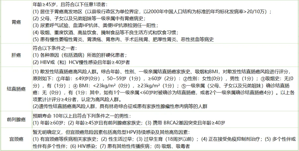 表1 中国常见恶性肿瘤筛查指南及规范推荐的恶性肿瘤高危人群定义汇总