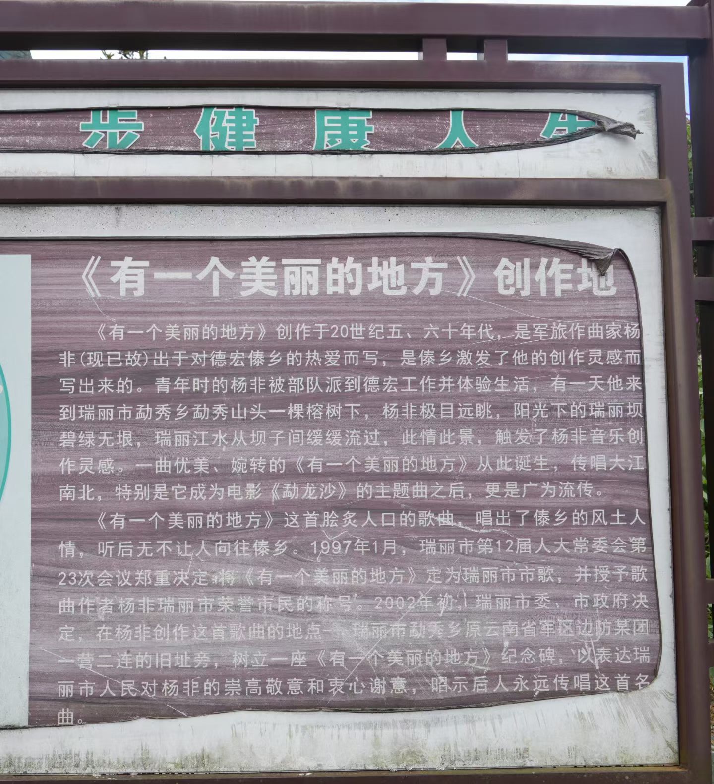 《有一个美丽的地方》由军旅作曲家杨非于1954年在云南瑞丽采风期间创作,灵感源于 勐秀山驻防时对傣族聚居区自然风光与人文风貌的观察。