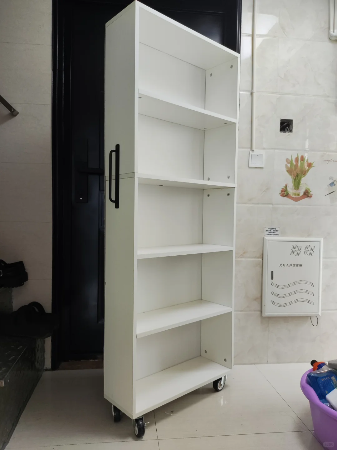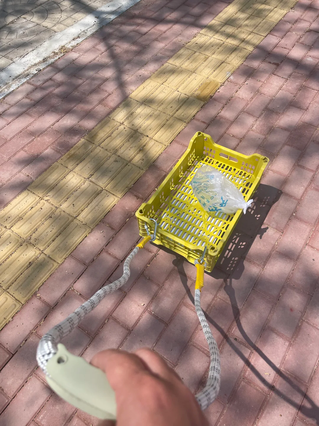 一个不花钱的水果框,然后准备4个万向轮固定在水果框的底部,再安上一根绳子就可以了,出门取快递遛狗都很方便。