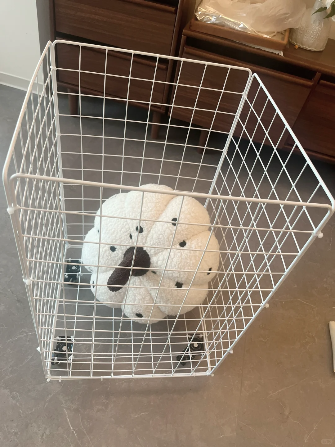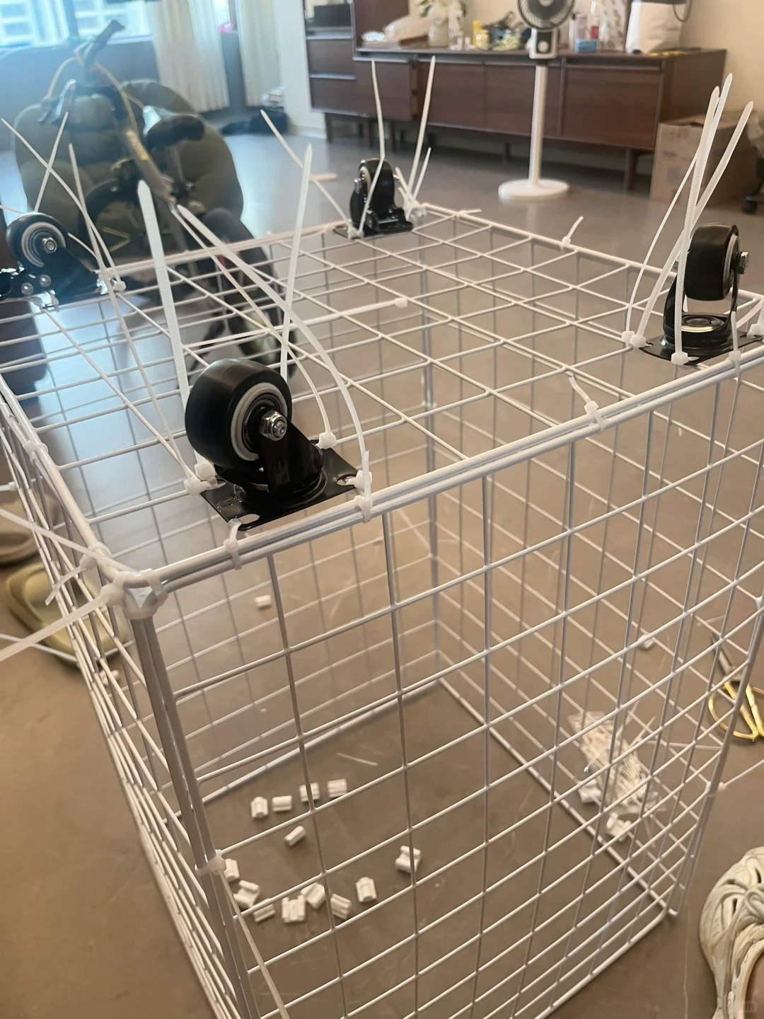 然后使用扎带固定在一起,再用扎带将万向轮固定在底部就可以了,用来收纳家里的毛绒玩具,健身器材或者当做一个脏衣篮都可以,嗯。