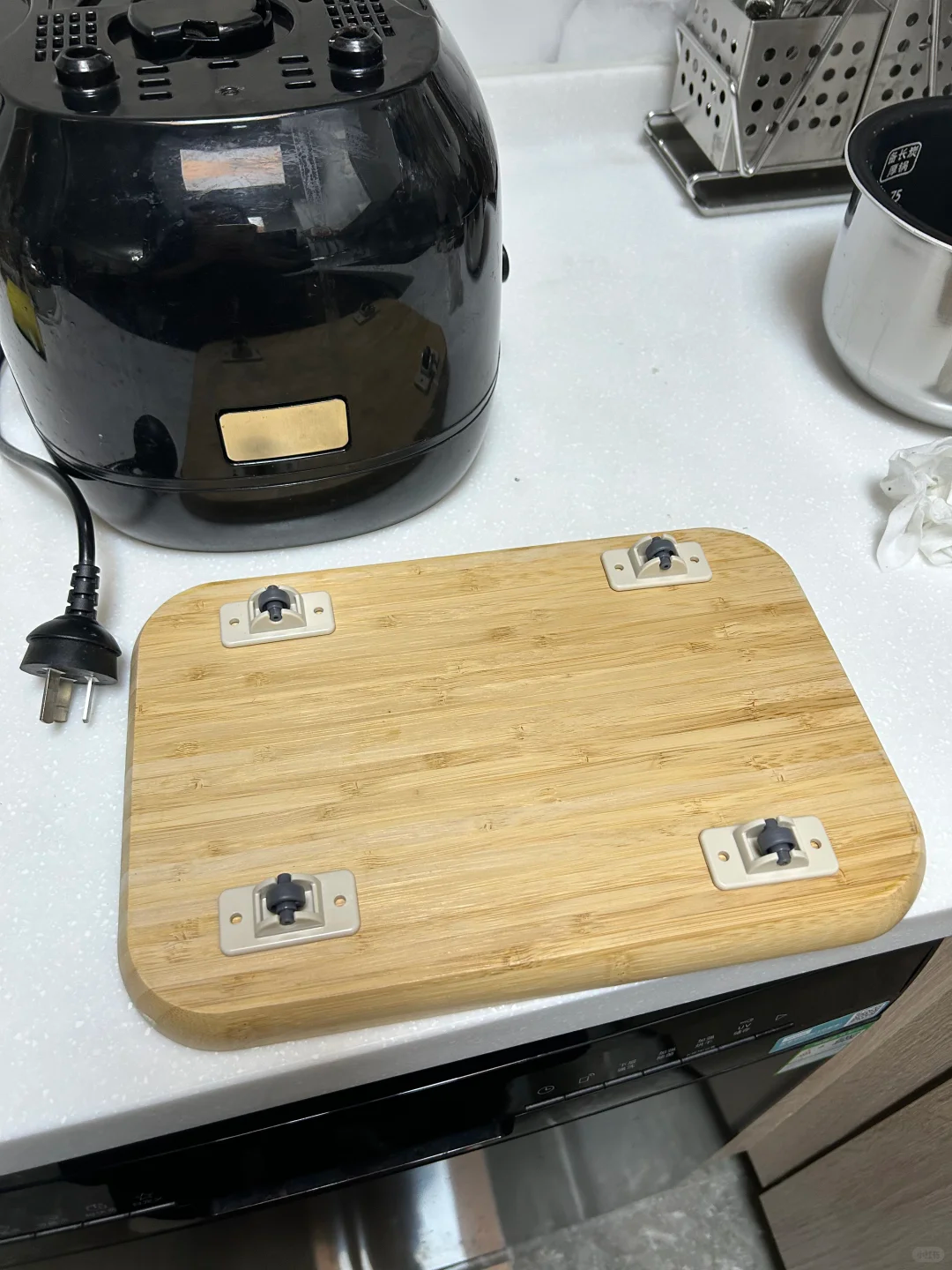 可以将家里的电饭煲空气炸锅放在托盘上面用的时候方便移动,不用搬来搬去,特别省力。
