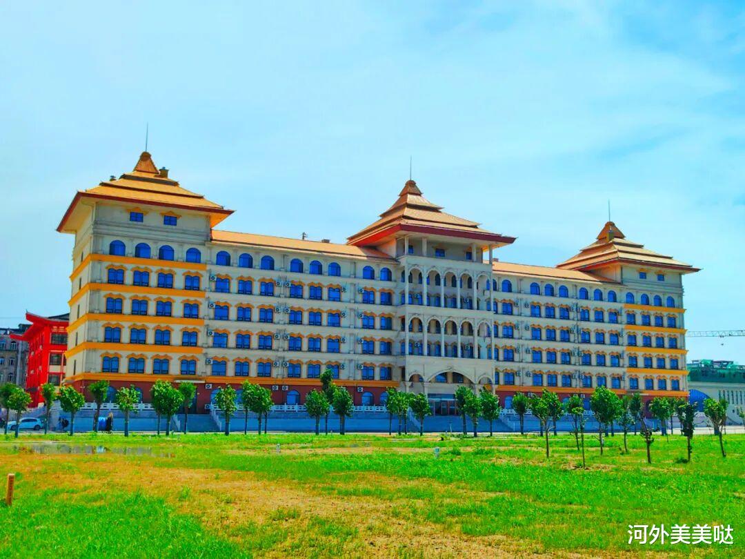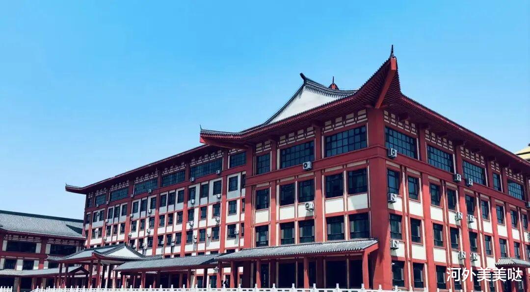 教学楼群错落分布在校园里。汉唐教学楼的朱红立柱衬着黛瓦,飞檐透着中式雅致;旁边的云贵教学楼藏着东南亚风情,不张扬的金黄屋顶、门口的精致廊柱,再加上成排亮窗,晴天时映着蓝天绿草,路过时总让人忍不住多看两眼。
