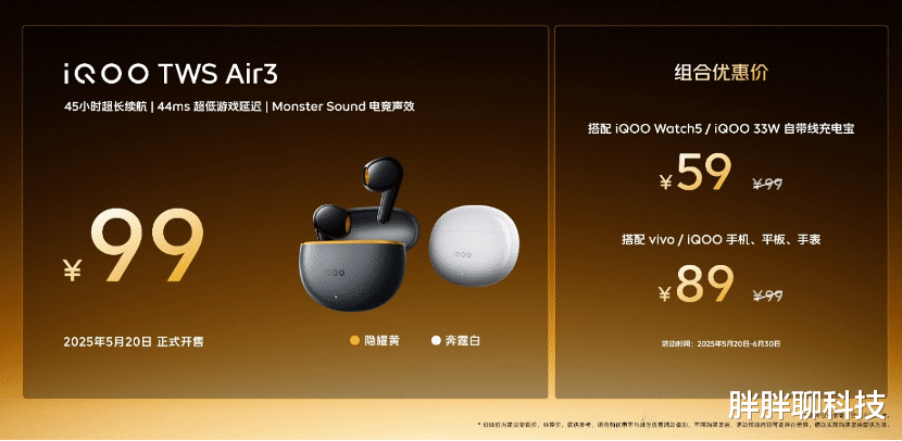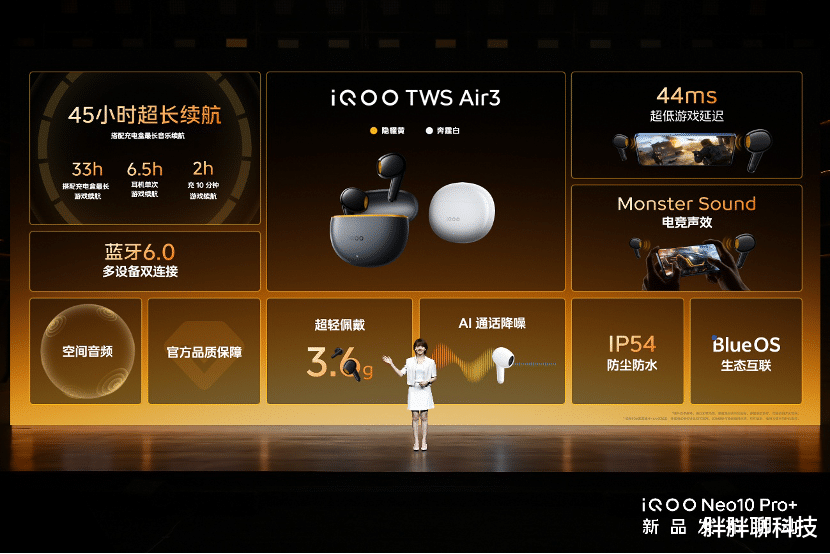 iQOO TWS Air3 具有“隐耀黄”和“奔霆白”两款配色,3.6g 单耳机佩戴轻盈舒适,支持 IP54更能安心使用;支持 LC3 音频编码,可实现全链路游戏 44ms 和耳机端 15ms 的低延迟;耳机单次听歌可达 10 小时,单次游戏可玩 6.5 小时,配合耳机盒可长达 45 小时听歌续航,而充电 10 分钟,就可连手机畅玩游戏2 小时,真正做到充得快、玩得久;拥有 12mm 高解析复合声音单元,具备空间音频、Monster Sound 电竞声效和 DeepX 3.0 立体声效,无论听歌还是玩游戏,都能带来更好聆听声效;支持蓝牙 6.0 多设备双连接和无线 K 歌耳返,并融入 BlueOS 生态,与生态内设备实现智联互通。