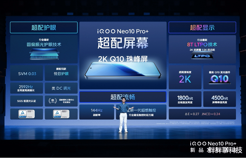 在屏幕方面,iQOO Neo10 Pro+ 配备旗舰同款 6.82 英寸 2K Q10 珠峰屏,PPI 高达 510,画面十分细腻,还拥有目前 2K 屏中表现更好的 1800nit 全局激发亮度,以及 4500nit 局部峰值亮度。具备“圆偏振光技术”,可让屏幕光线如自然光般柔和,有效减轻用户因观看屏幕造成的视觉疲劳和干眼症状,实现硬件级的真护眼;屏幕支持 2592Hz 全亮度高频调光和类 DC 调光两种选择,可实现低至 0.03 SVM 的行业低频闪,并搭载旗舰同款“悦目护眼”技术,实现全天候、全场景、全人群护眼。