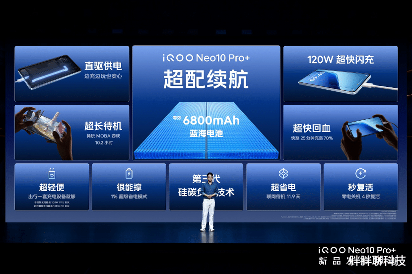 续航方面,Neo10 Pro+ 的电池容量在目前 2K 屏旗舰中更为领先,搭载等效 6800mAh 超薄蓝海电池,可以畅玩《国民级 MOBA 手游》10.2 小时、连续刷短视频 18.8 小时或视频通话 11.3 小时,还能联网待机 11.9 天;1% 电量下开启超级省电模式,可待机 3.1 小时,通话 31 分钟。