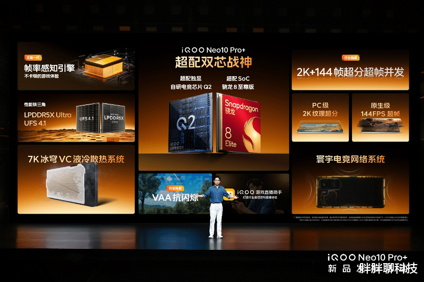 在手机产品线中,iQOO Neo10 Pro+被官方定位为“更为强大的游戏性能旗舰”,配置自然拉满。在核心配置方面,iQOO Neo10 Pro+ 搭载“芯片王者”高通骁龙 8 至尊版,具备 Adreno 830 GPU,携手 LPDDR5X Ultra(9600Mbps)和 UFS 4.1 组成“满血性能铁三角”,更有 iQOO 产品中迄今最大的 7K 冰穹 VC 液冷散热系统保驾护航,对比上一代散热能力大幅提升 15%。