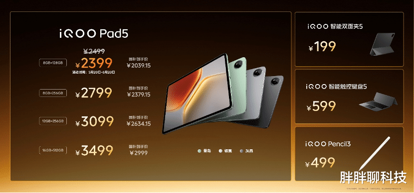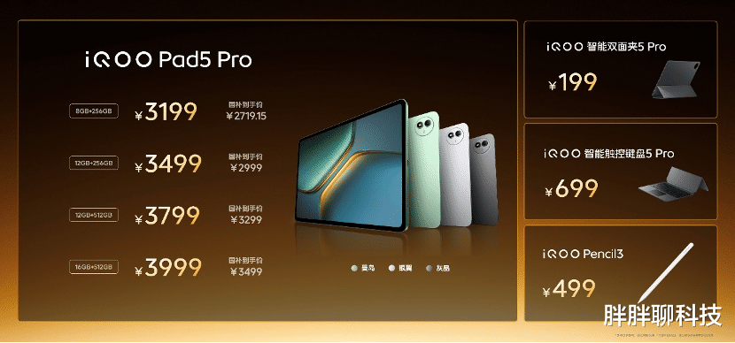 iQOO Pad5 系列共有“曼岛”、“灰晶”和“银翼”三种配色可选,iQOO Pad5 Pro 提供 8GB+256GB、12GB+256GB、12GB+512GB 和 16GB+512GB 四种存储组合可选,到手价 3199 元起,iQOO Pad5 提供 8GB+128GB、8GB+256GB、12GB+256GB 和 16GB+512GB 四种存储组合可选,到手价 2399 元起。