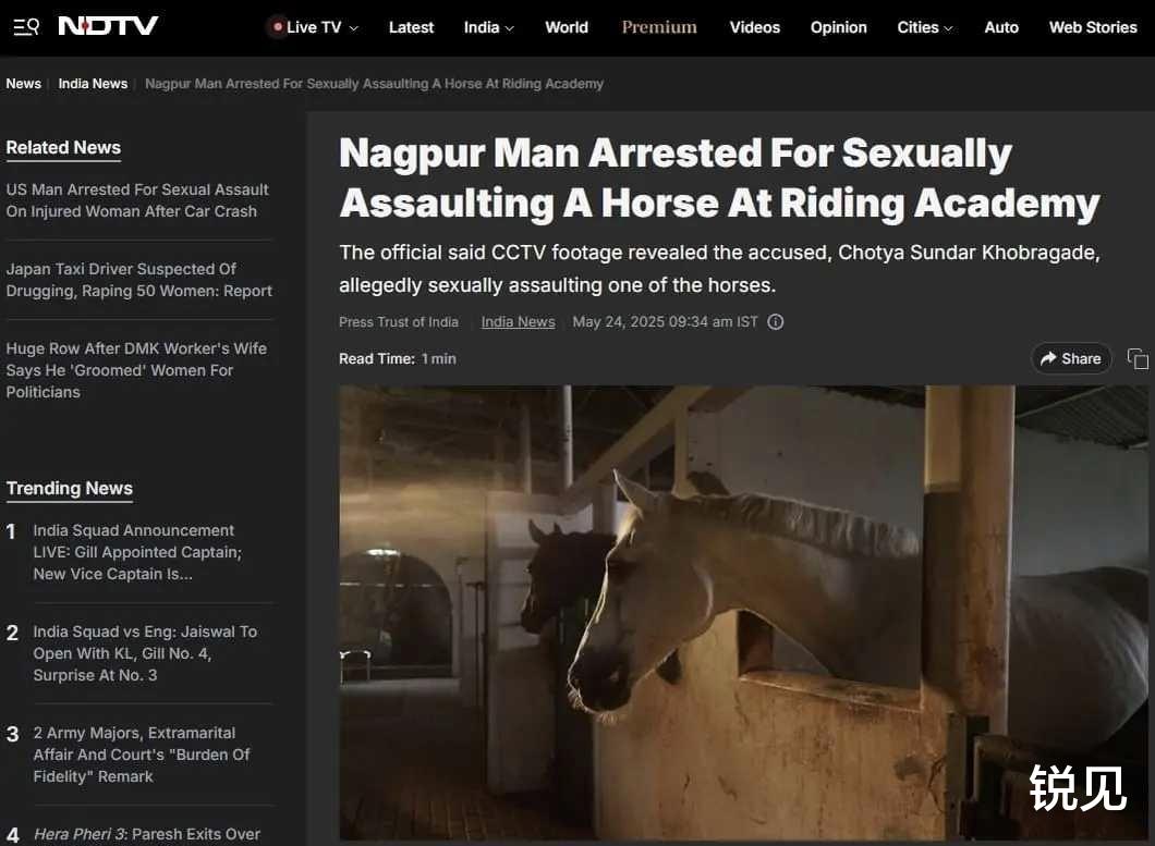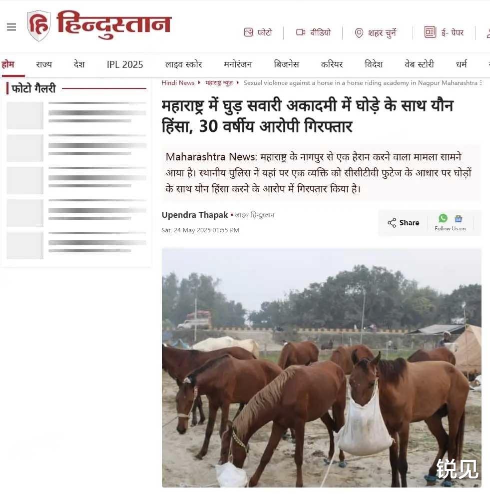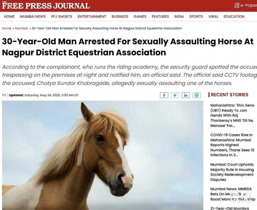 这年头,新闻不看不知道,一看吓一跳。印度又出“猛男”了!一名30岁男子深夜潜入马术学院,不是去偷马,也不是去学骑马,而是……对马儿实施了性侵!你没看错,就是性侵马匹!这操作,简直是刷新了人类下限的新高度。