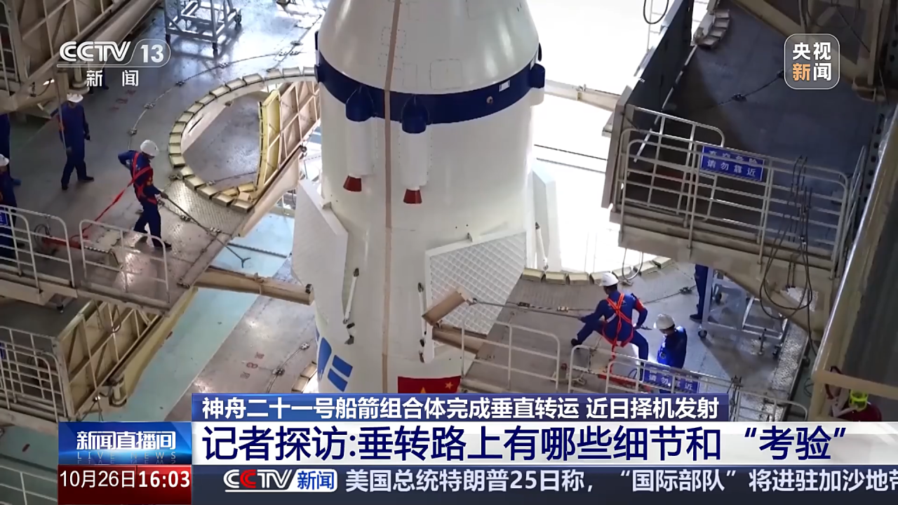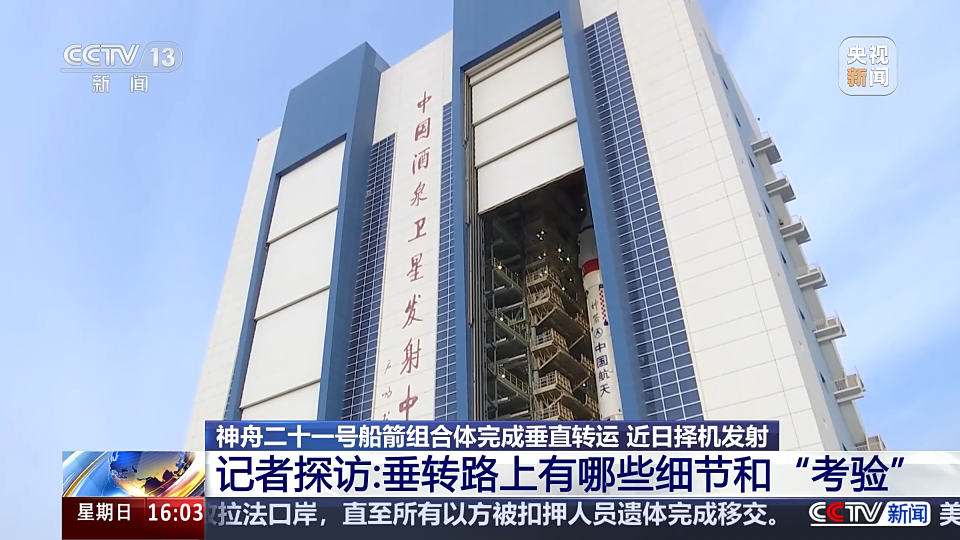 而就在航天路通车的前一天,10月24日,在路的起点——东风航天城内,神舟二十一号载人飞船与长征二号F遥二十一运载火箭组合体,开始了从厂房到发射塔架的垂直转运。