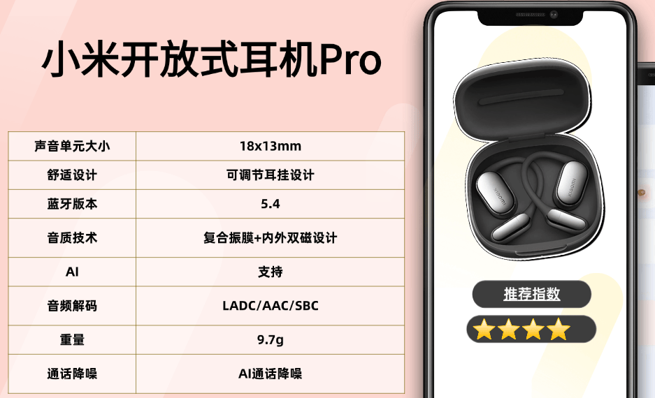 小米开放式耳机Pro采用人体工学设计,通过计算的耳挂曲线实现舒适稳固的佩戴体验。开放式结构确保用户在享受音乐时能持续感知周围环境,提升户外使用安全性。搭载18×13mm超动态双磁动圈单元,采用复合振膜与内外双磁设计,带来更强劲的驱动力。人声表现饱满细腻,中频密度出色,高频延展明亮通透。其声学结构在控制漏音方面效果良好,低频量感与下潜深度在开放式耳机中表现突出,适合对音质有较高要求的用户。