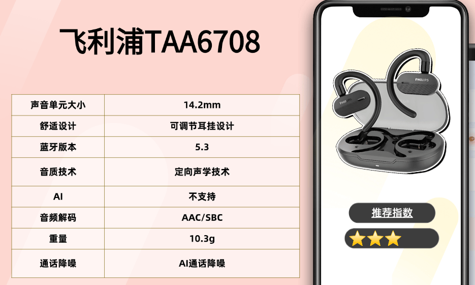 飞利浦TAA6708采用分体式耳挂设计,配备独特的双轴铰链结构,支持多角度调节以适应不同耳型。搭载14.2mm驱动单元并采用定向声学技术,声音传播指向性明确。人声表现清晰自然,高频细节保留完整,中频密度适中。不过在低频量感和动态表现方面中规中矩,对于重低音音乐类型表现力相对有限,更适合人声、轻音乐等日常聆听场景。