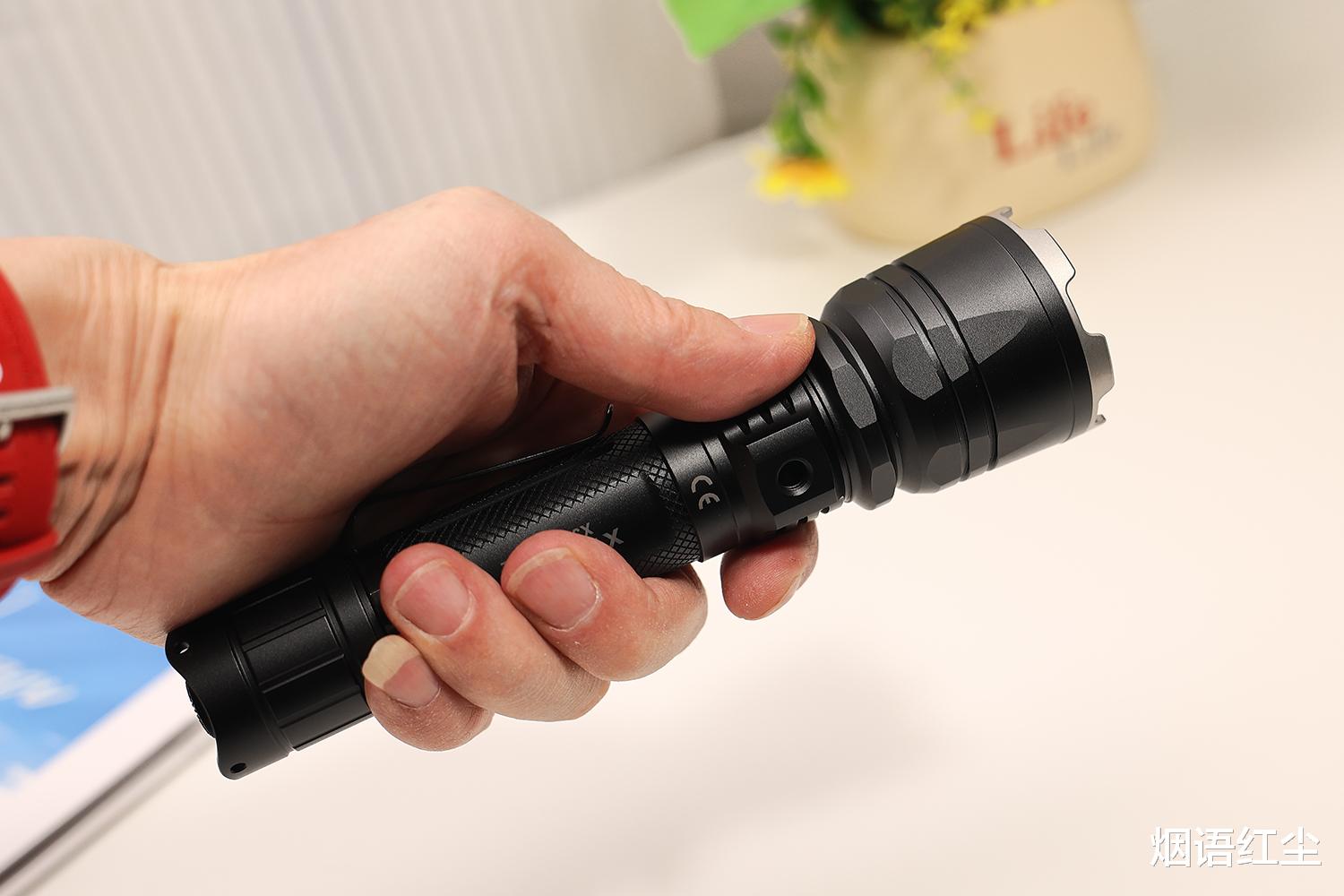 在材质与工艺上,这款手电更是做到了专业级水准。机身采用高品质铝合金打造,兼具高强度、低密度与快速散热的特性,面对户外的磕碰、摩擦都能轻松应对。表面做了黑色HAIII级别军规硬质氧化处理,不仅让整体质感更出众,还大幅提升了耐腐蚀、耐磨损能力,就算长期在户外潮湿、多尘的环境中使用,也不用担心机身掉漆、生锈。灯头处配备了3.5mm厚的五幅不锈钢压环,像给灯头加了一层“防护铠甲”,能有效保护内部光学组件,避免因跌落、撞击造成损坏。筒身设计也十分用心,经典的小菱形防滑纹让握持更稳固,就算手上沾了水、泥土,也不会轻易打滑,灯头和灯颈的五条宽大散热鳍,还能快速散发光源工作时产生的热量,保证手电长时间稳定运行。