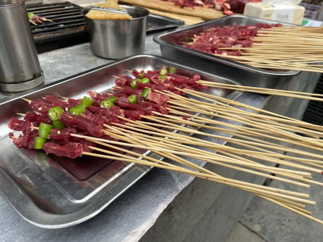相比夜晚,白天的松潘热闹极了。古城四四方方围着,我们从城墙一边,走向另一边,到处是卖物品的商贩。价格不贵,袋装的菌菇 12~15 元不等,藏族风格的彩辫 10 元钱 6 条,最多的是牛肉串,老板坐在烤炉前,边切边串,1 块钱一串。媳妇买了 10 串,我吃了五串,肉质紧实,相当 Q 弹,无比美味。