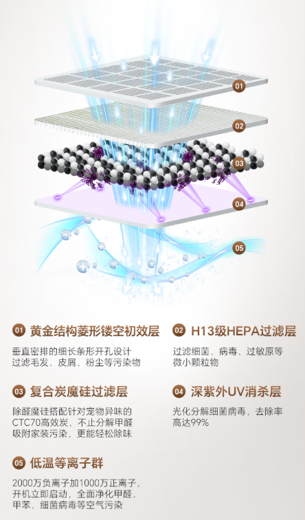 能快速分解这些异味,TVOC 去除率达 99.0%,实测在 30㎡ 客厅,20 分钟就能消散咳嗽异味;